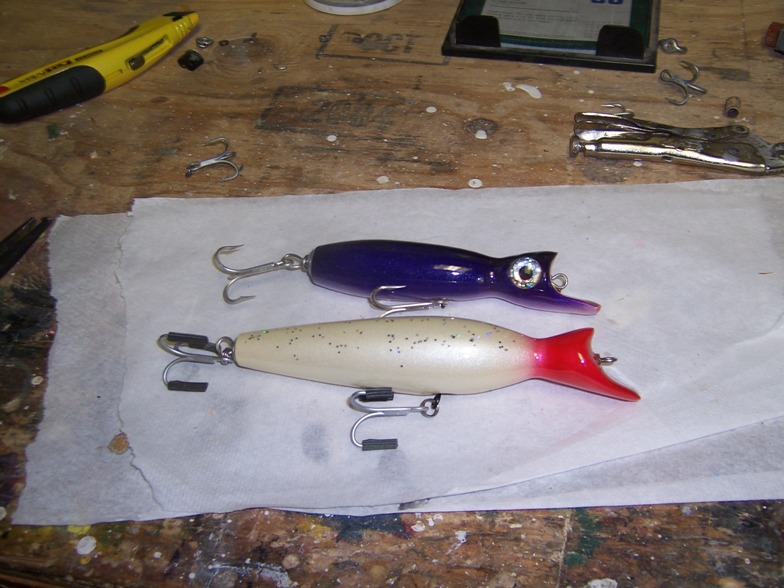 the top one was the first effort... brass wire and pinned tail hook... it didnt swim very well.. it never caught a fish either.. the middle plug was the next step.. it took hundreds of bass and was refinished twice.... it was the last plug i painted (on a regular basis) with rattle cans.. i retired it last spring. in favor of the fish catcher below it...