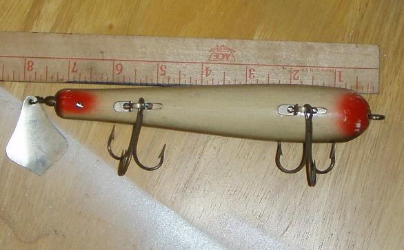 Very nice plugs Tagger. Here are some pics of my Sylvester Flaptail for comparison. Your rigging is slightly different. On the original the swivel is actually screwed to the bottom of the plug into a countersunk spot.