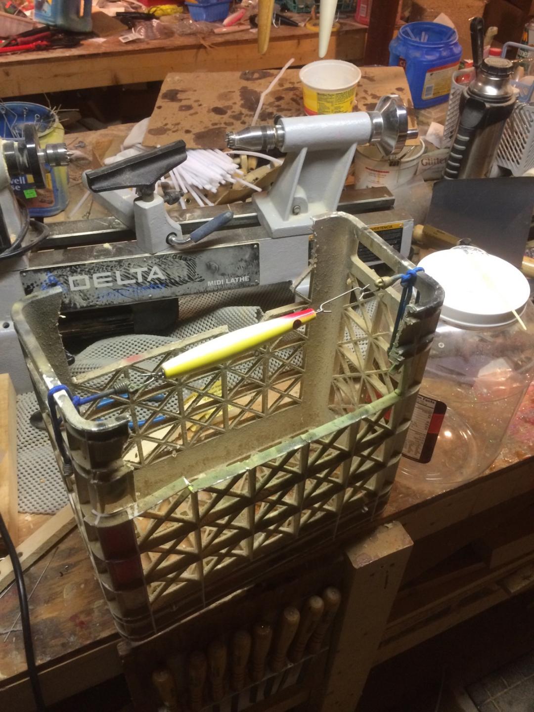 I have a little crate with the front cut away that I use to hold the plugs while i epoxy them, uses mini bunji cords so I can rotate it to get all sides. I put a little hook made of scrap wire up front. When done with the epoxy I can hold that while I unhook it, and use that to carry over to the spinner.