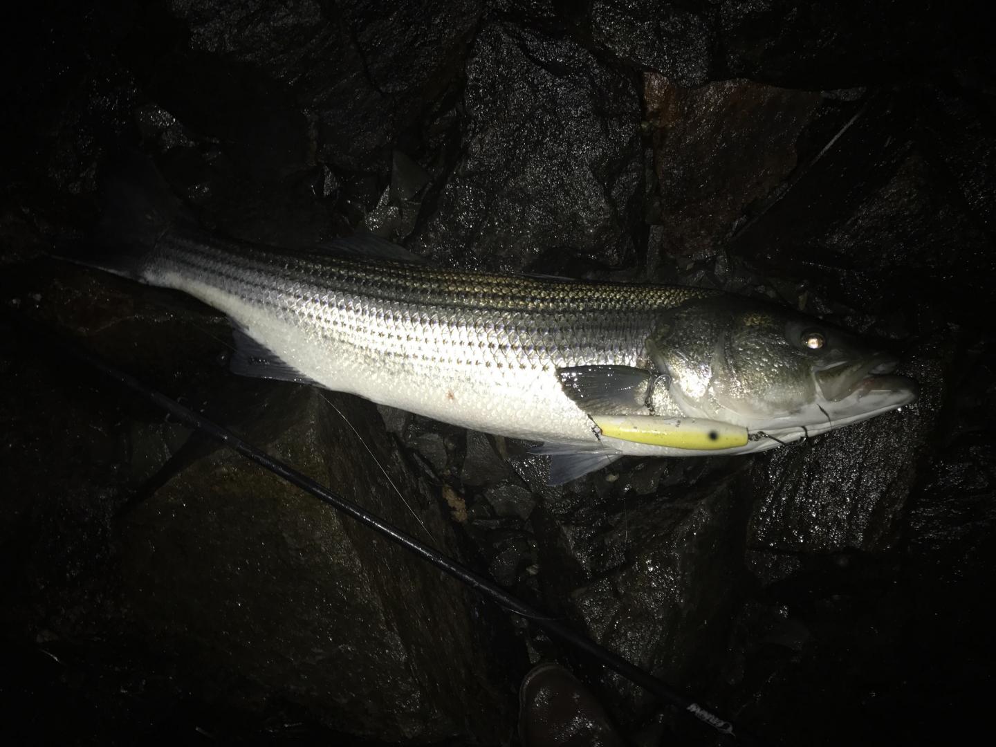 I went out last night to a favorite spot I used to fish a lot and was reminded why I don't fish there anymore, a line of people. So I went west, way west and fished the whole west tide. Got fish on the first cast on darters by Chuck, this yellow one and a dark blue mackeral one too. It took a while to fish thru the schoolies to get a decent drag burner and some other decent fish but worth it. I did not do so well jigging. I was glad to have a few poles worth of real estate to myself when this fish took off. Not as big as I thought it would be but that is plug fishing.