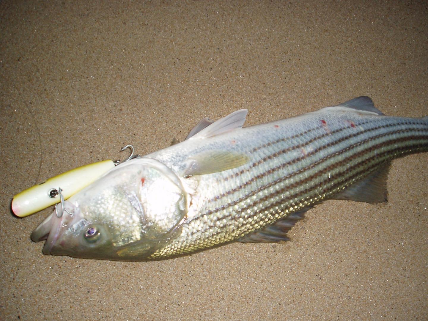 I made a small 3/4oz. pencil popper earlier this year and have been taking lots of fish on it recently. I really just had Albies in mind when I made it but it has been working well for keeper bass when there on peanuts. The bass in the picture is 38" and was a decent fight on my albie setup.