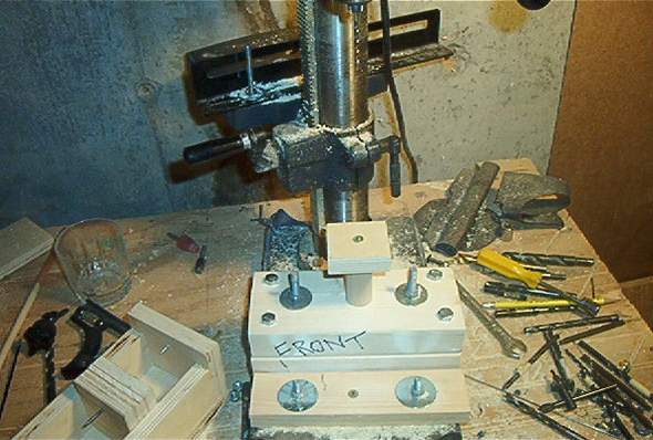 I took 2 lengths of two by fours and bolted them together. I then drilled 2 holes for bolts to attach it to the base of my drill and a large one inch diameter hole that is centered under the bit.