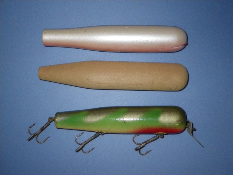 Hi Tagger.I'll have to dig them out. I'm in the middle of renovatin my garage for a shop. Made a mistake and tried to fix the retaining wall and my current occupation is ground hog.Both septic and electric in the way so the diggin is all by hand. Big downside is the guy who built this place was a very close relative to tim the Tool man.When I'm done I'll try to dig them out. Funy part is was that Bob thought they were a mistake as they spent most of their time in the sand instead of swimmin so he stopped after the ist run. he gave them to me while he was gettin rid of some what he called junk while cleanin the shop as I have a narrow gut I fish that has a rippin current.He tried the idea again as a request in the styro bodies plus in the P-40 in the early 80's for use in the race.Only did a few of those also.You may want to keep an eye out as he also did a few small reverse juniors the same way.Only about a dozen of those exist.Some of the protoe I have have the weight wrapped around the wire. He used fly tying flat lead a lot in the beginning.As for the wood he used well some are cedar and some are pine. What type I'm not sure. I have 2 protos that weigh different and neither is weighted.almost 1/2 oz different.I'm hoping someday to be able to put a complete display of his stuff together and take it to the shows. I chase the stuff all over the place.Bob's grandson may even have some of the spec paperwork on them if I can reach him I'll see what he has.