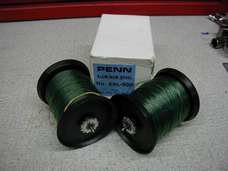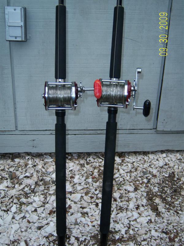 Both Reels set up with 300 ft. of Monel wire, one has a Stainless spool the other chrome / brass spool, and 2 Spare spools loaded with 30 lb. Berkely Big Game mono to interchange for versitle fishing with these rods.