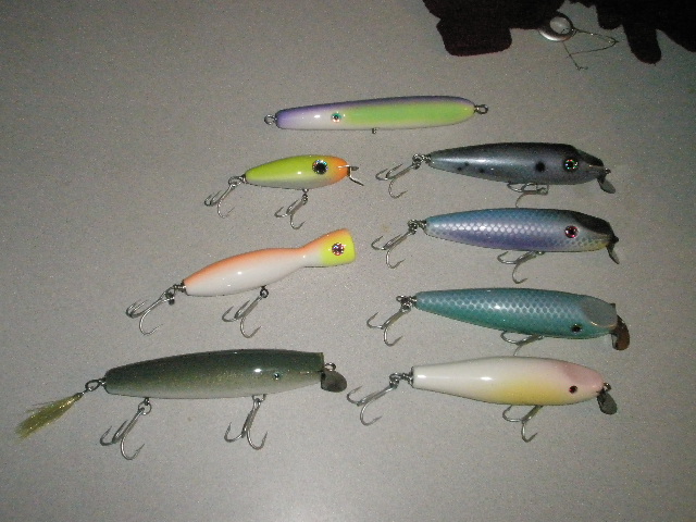 I'm getting ready, I just came up from the shop now to register for the Rotary derby, so I checked in.... I''m working on a display of various methods of rigging a plug, from screw eyes, to cotter pins, to external rigging... in each set there will be one plug that gets "band saw eddyized"to show the "guts" and one finished off adornig the matching rigging... it broke my heart tonight to cut in half a 7 " Roman Nike copy, a Norris squid copy and a Captn bills swimmer ( all made by me, no originals were destroyed in the proscess) but it got eaiser each time..I'm trying todisplay ( to the best of my knowledge) the rigging used by each builder... I've still got a pile of plugs to cut, the display ought to be pretty neat... and I might find a plug or two to set up on the table as well as a few for HO'in..