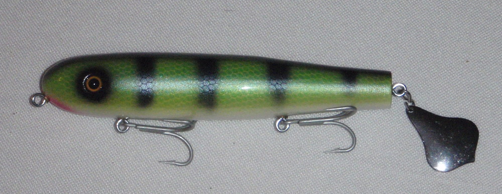 Old Heddon Swimmer/Flaptail .. I was really trying to build something that would appeal to Steve . Something he'd pic up and give that look . Had to be plain old basic colors .. Plain old black/gold for Steve ..