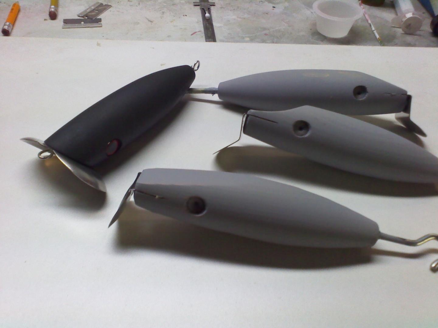 I guess like myself when the weather gets better we seem to leave the solitude of the dungeon for activities like lawn, house work, yard and ah, fishing. I did make a different style of plug and modified it into 3 different designs. Took a similar shape as the Sea Fly and made it into a cowboy, surfster and pikie. Weighted and drilled them the same except added a chin weight to the cowboy to aid in diving. 5" long. 6 gram belly weight, chin 2-3 gram. Cowboy AYC, others red cedar. Swam a proto of the pikie in a private pond. First cast a small bass smacks it, not once but two cast in a row. That was convincing enough for me. The plug was freash off the lathe w/o sealer, color & eyes. had the idea to take the same style and come up with the variations.