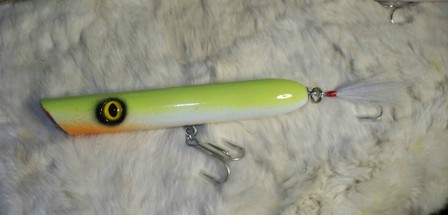 Canalman, I think I posted them befor, there GLIDERS I did for a SWAP an I have a few extra, you can have one, just see me at plugfest, there 6"long an made from 3/4 PINE -->(ROADKILL) HANDCARVED, SEALED, PRIMED, an PAINTED. there is 1.double oo after the belly hook.