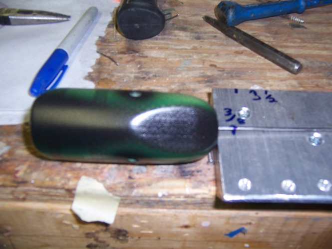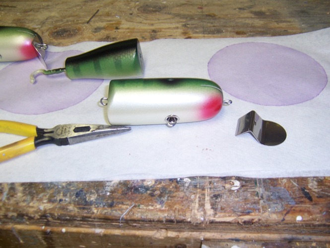 these photos show the assebelly of the plug, for these plug i chose hangers over swivels ( these plugs swam better with the hooks tight to the body .. long story) the holes on the jig are larger going from left to right, and awl makes the perect tool to spread the loop..