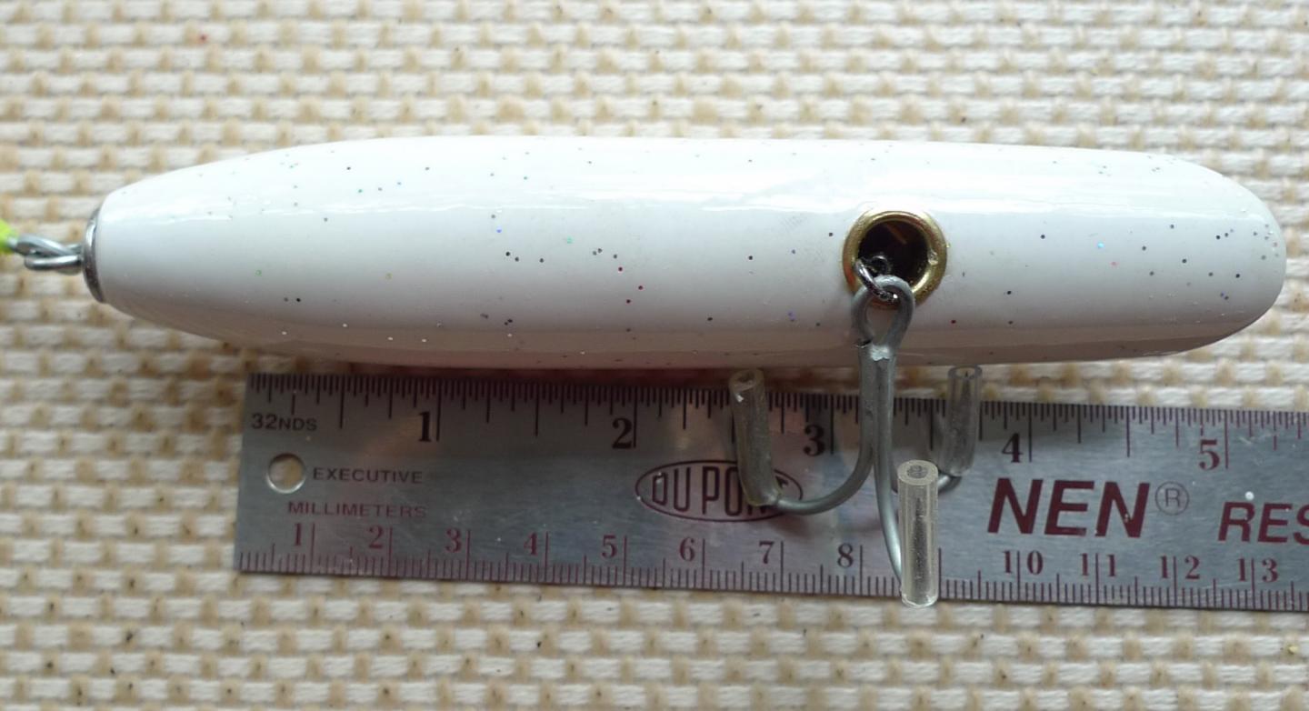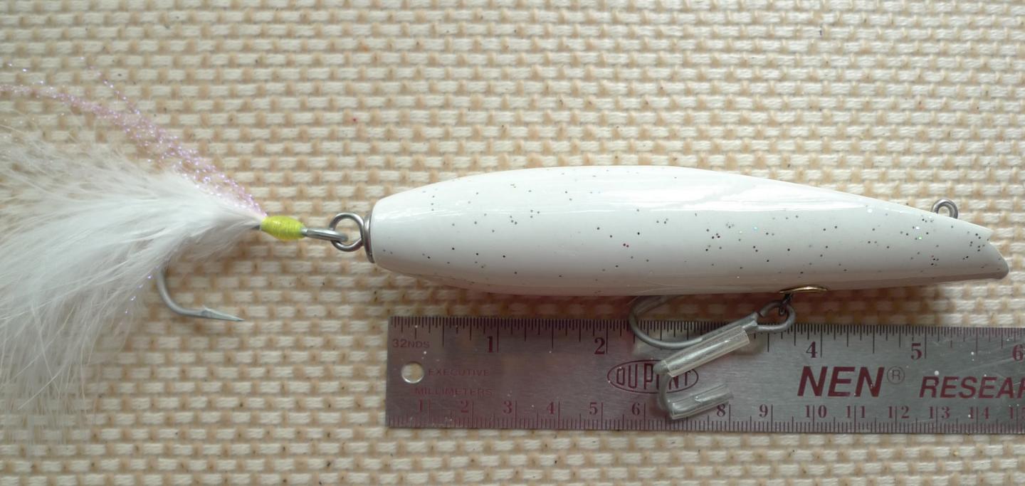This white dartah is now finished and will be in the mail to The Greek later today. Maple body, no wt needed, dressed the tail hook with some white marabou, and a little pink flash, cut 3/0 belly hook. Clear coated with devco 2T with some holographic sparkles mixed in....