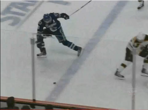 They showed the play leading up to that goal and you can see the Bruin player getting whacked on the back of the calf and fall down as the offending canuck set up shop for the shot.