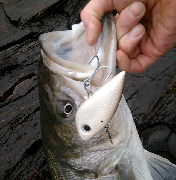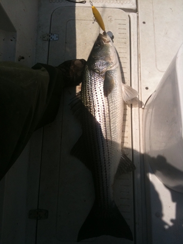 A bass on a surf howdy clone PlugFest swap plug from Lower. This plug was a joy to cast and "swam" great. (Nice work man)