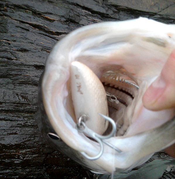 Crappy picture of a fat guy in a wetsuit with a low 20 bass (the fish is rotated) on a sweet little 1.5oz musso darter clone. This is a smaller darter than the little ones I gave out at plugfest. Runs deeper. I like the plugfest versions better (a white one has been my best plug this year), but this smaller one looks like it has lots of potential as well.