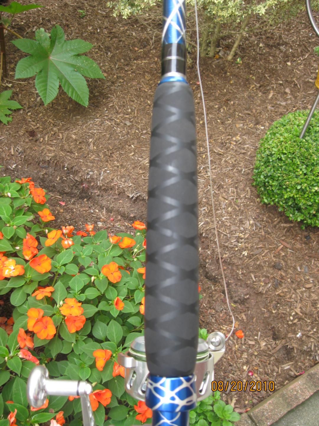 Wanted to do something new and easy. I added a silver streak of threads on all guides but the top 2 for a little more action. Silver streaks taper as guides size drops. Coral reel seat and matching gimbal from ebay. shrink tube over eva. aluminum winding check