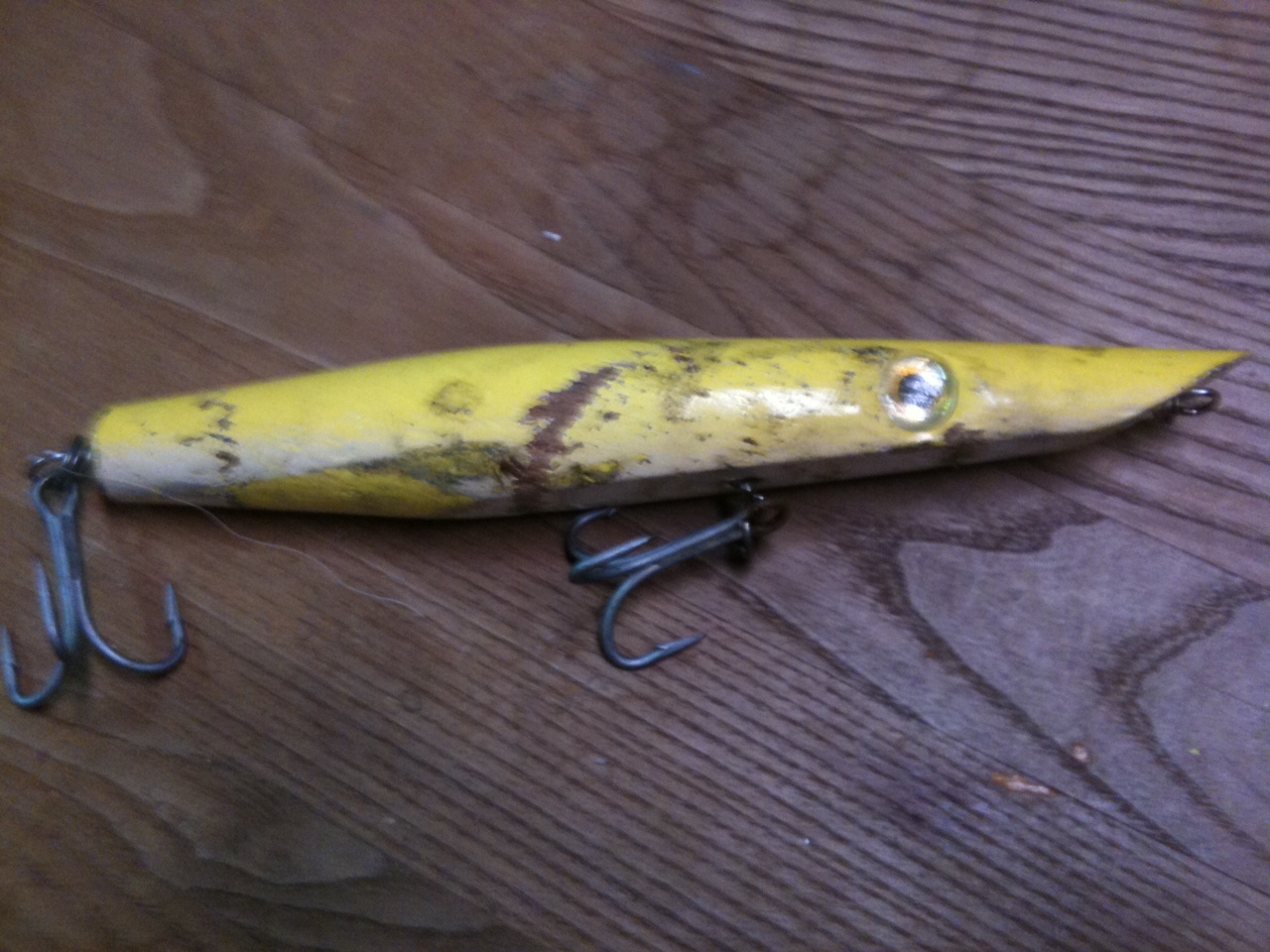 Lets see your top hook rash plugs. This pencil popper that is painted with spray bombs and clear coat on it and that's it, the weight is 2.8 ounces and casts very well. The last boat trip it landed fish from 30-36 inches...