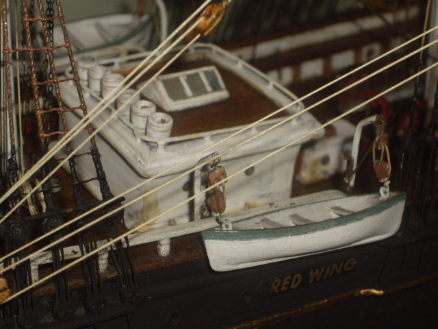 The model came from the estate of a George McQueston 1887-1975 who made his fortune importing quality wood to the shipbuilding and homebuilding (finish) industry. He was well to do as he got Mass license plate #4.... all during the post-depression time that Mayor/Governor Michael Curly pulled #5 for himself. If I had to guess, the model was made in the 1930s, possibly earlier, so no plastic, all lines go through working blocks, and all knots appear to be tied, not just glued. I was in his house in the 70s, so I know from all the high end wood trim in there that he wouldn't buy anything but the best. It might be worth some dough, or not.... Depending on an appraisal, I might turn it for a new kitchen, or maybe just a cabinet...