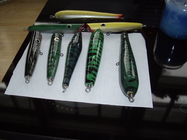 I've finished more plugs in the last week than i have ever done is that short of a time span...last night I worked on this pile AFTER. i put 24 more into the box for epoxy.. for the first time ever I have nothing "in process"...these are not all for plugfest, as I needed to restock.. but a good bunch of them are... I made some big trollers.. as you can see in the picture the goo goo is 8" ( Salty dog one is for you).. it's a big puppy finished it weighs 5 ounces...