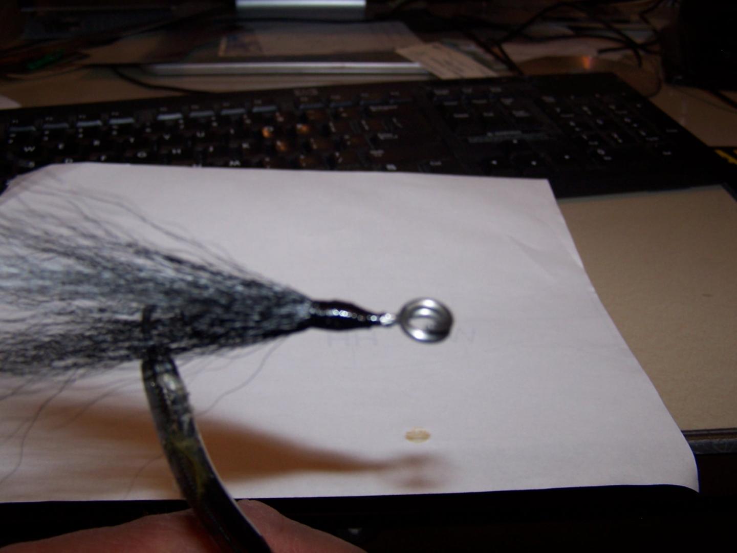 Here are some pics with tag on the tail. Please note that using this wire is a little more difficult, because the twist in the wire doesn't open as easily as a split ring does. But if necessary the 308 wire tag can be pried apart with a tiny screw driver and then compressed right back together using a pair of pliers.