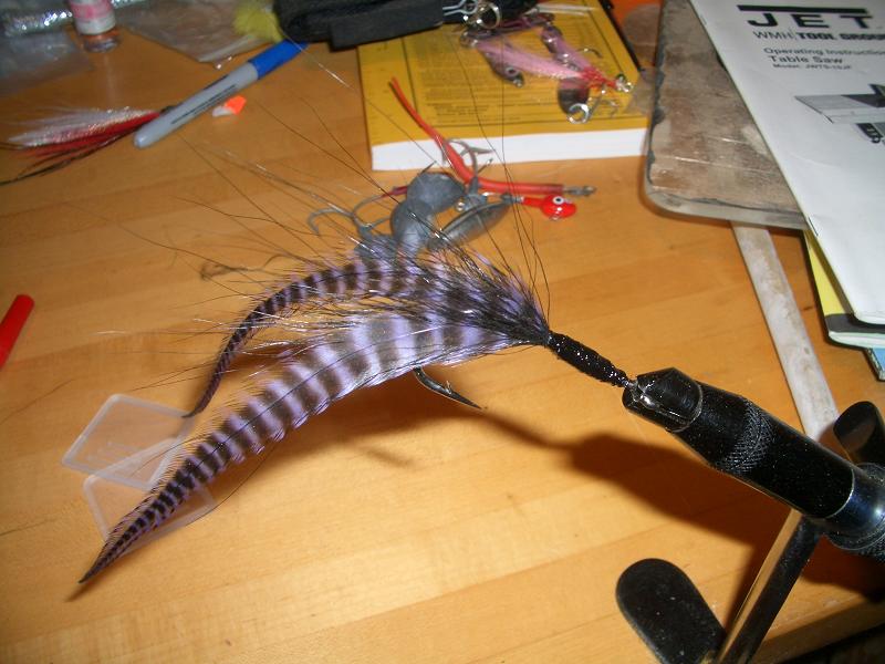 This is tied on a 3/0 or 4/0 Gamakatsu Open Eye Siwash. feathers drape down about 6" from eye of hook.