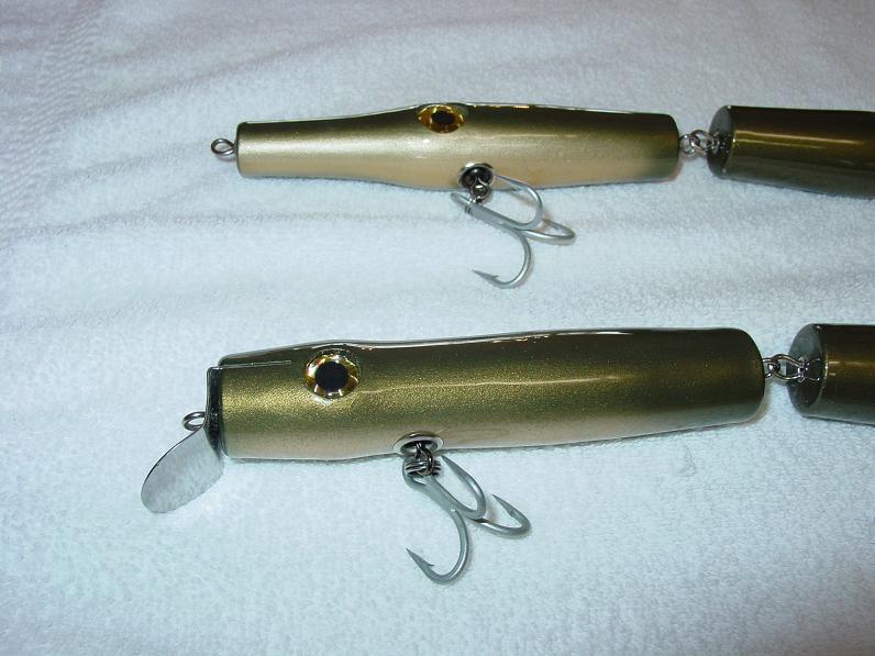 The jointed needle I finally got to swim right and cast. The body of the needle is 9 3/4 in long and fully rigged weighs 4oz. Total about 15in.