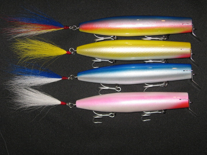 A couple of large 7 1/2" Musso inspired plugs. The top two are surface swimmers and the bottom two are divers, high hopes for these.