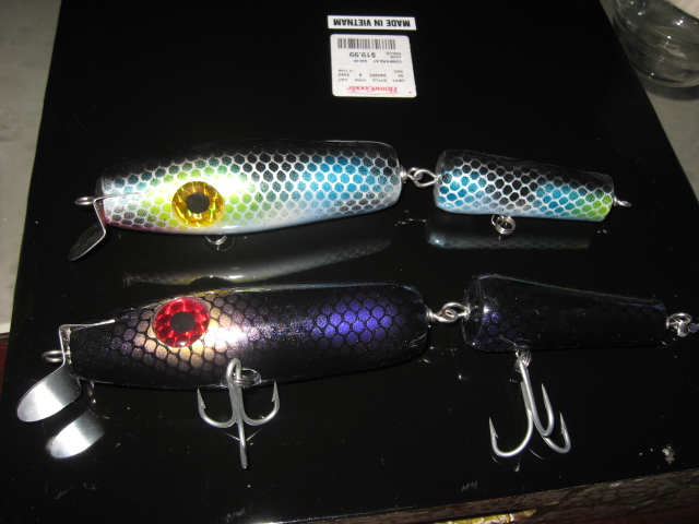my shape with some classic colors. 5/0 siwash with bucktail and 2/0 trebles, all weigh about 2.75 ounces, cast a mile. krok swivels, #5 wolverine splitrings and 308 wire. Ready for plugbash! Pic of my first joints too...