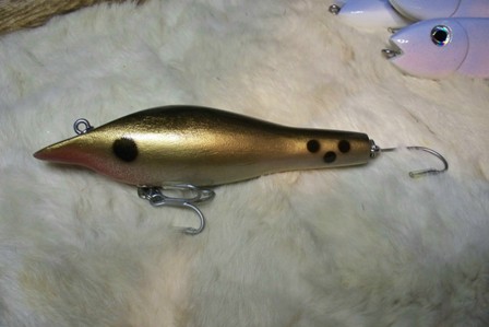 My first again theres so meny plugs to build after 6 years Im still doing FIRST, an have more on my list to do. anyways here it is 6.1/2 long, weight in the tail, havent weight it yet. Ive seen a lot of them an had a hard time doing the HEAD SECTION. like my DOTS just starting to get them down also, after looking at another plug I saw I put them upside down. I took it swimming the outher day, swam pretty good, I even smashed the lip section on bottom, shallow water. so now Ill top coat it, an beat the hell out of it next season. this will be my 1. an only to hard to carve all the angles