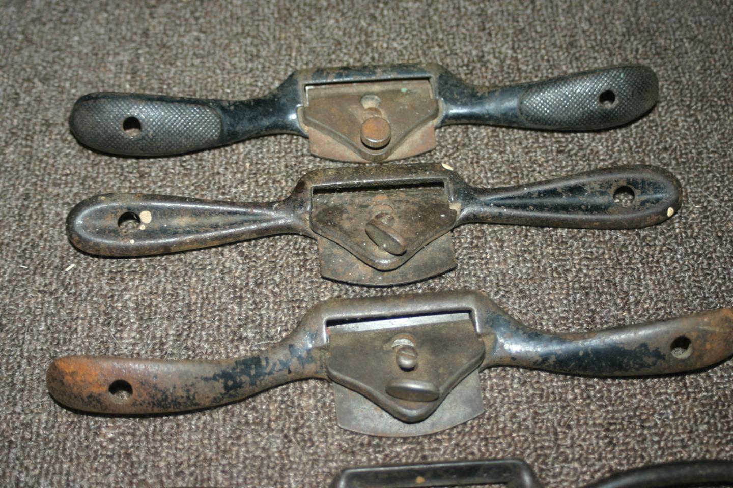 5 spoke shaves for sale. The two on the right are made by the same co. although there is not a name on them it does say Made in USA. One say 51 and the other 52. The center one is very similiar to the ones on the right, no markings though. The one on the far left has two blades, a striaght and a con caved. $10 each, $40 for all five.