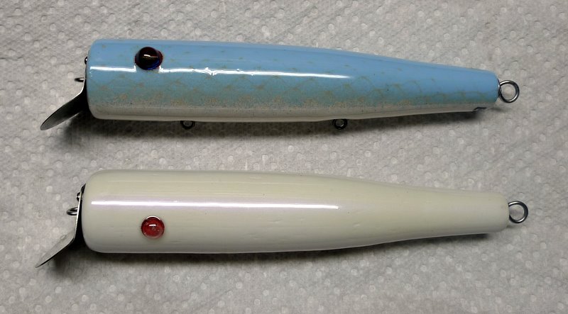 I thought I was done building but after going to Plugfest I had to make a few more plugs based on ideas hatched from talking with all the great plugmakers. This is the first time I have made front weighted 6 3/8 inch Goo Goos to fish rips off the cape.... can't wait to try them