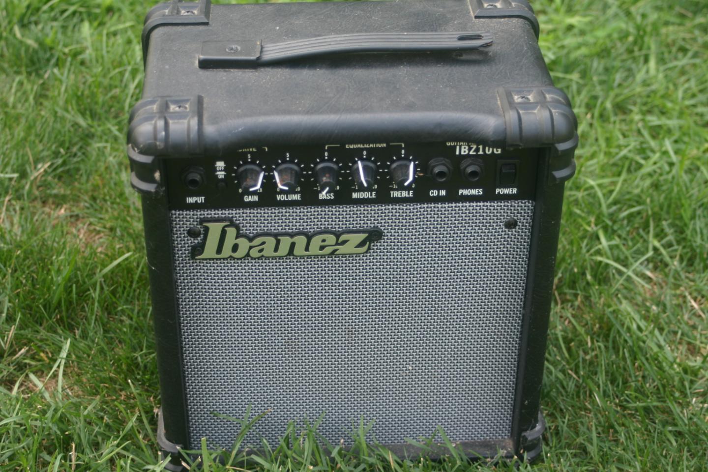 The amplifier is also in good condition with the exception of the catty strap is missing one of the screws and metal cap that holds it on. Ibanez model IBZ10G. 22W is perfect for an apartment.$40