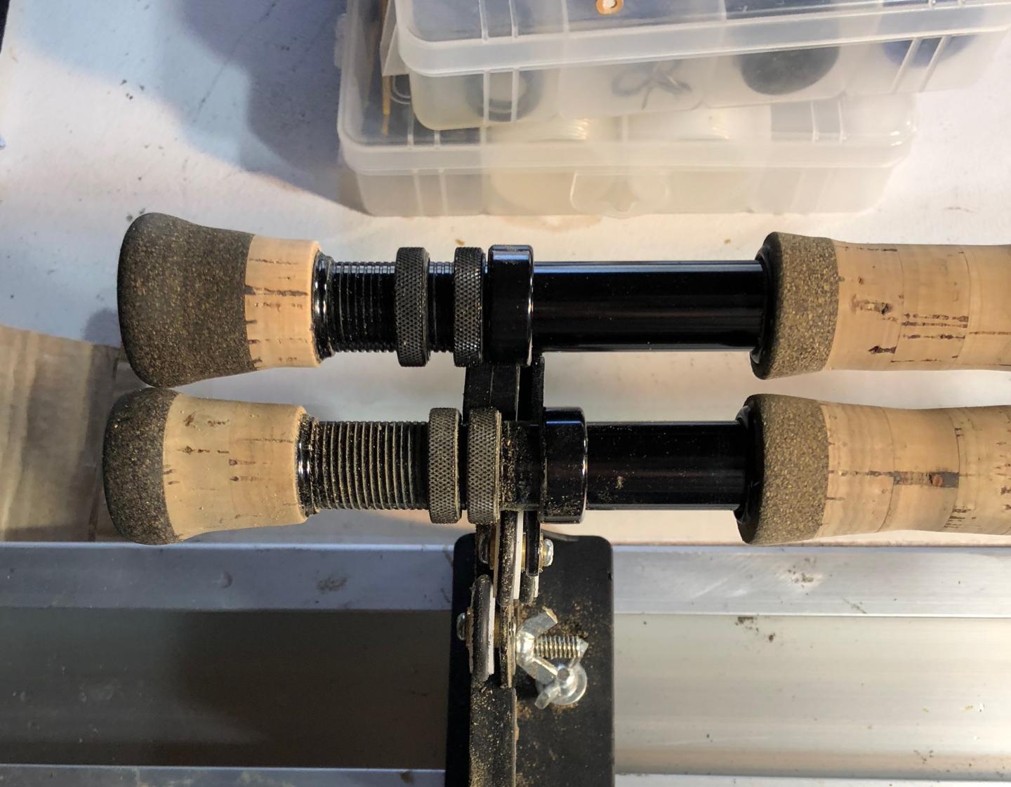 The handle on the 10wt is done. I'm going to do the 9wt handle next, then wrap. The cork work makes too much of a mess to have to clean up twice.