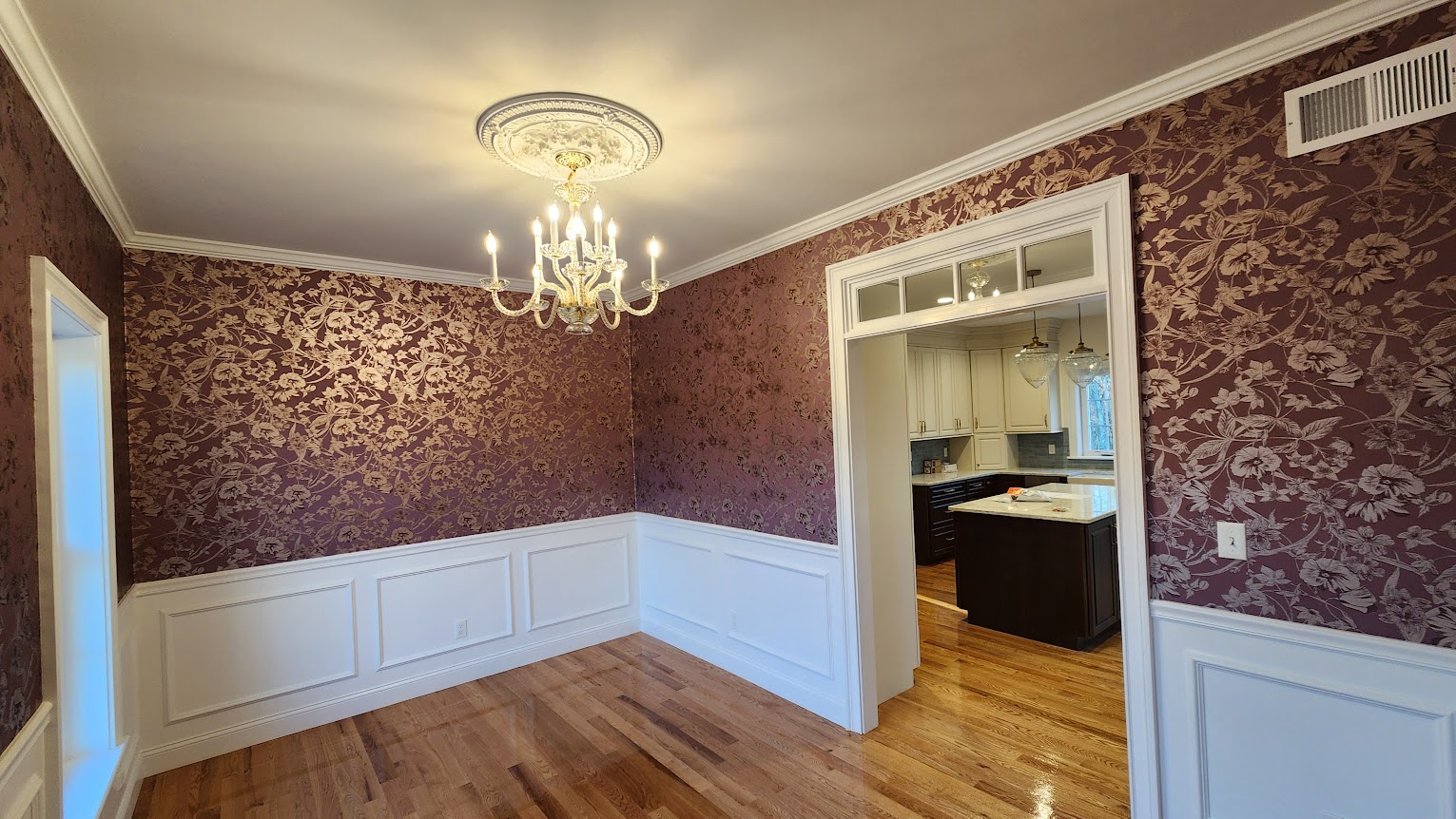 Nice details, that wallpaper looks spendy, not many people use it any more. I do hope that old brass finish ceiling fixture is temporary.