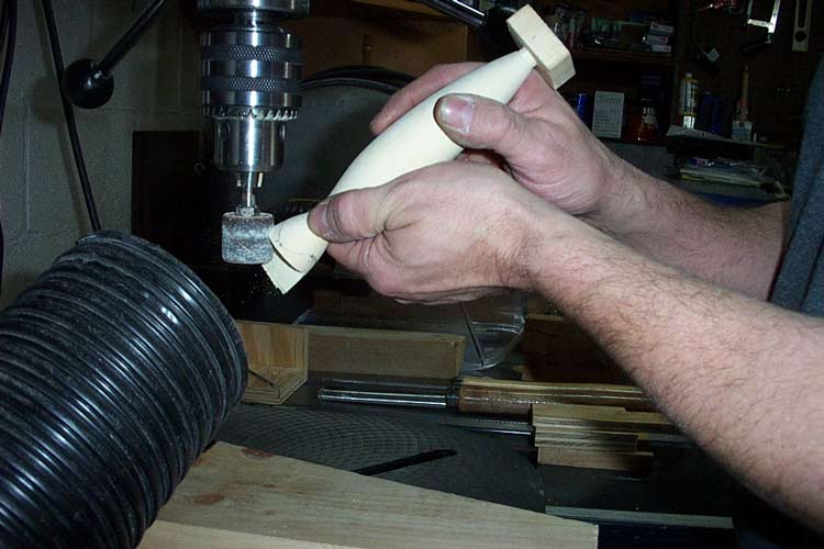 I have assembled some pictures on how I shape my bottle lips, I have tried to make it as easy to understand as I could. I know a lot of guys don't use large bottles but the pictures and dimensions are for a 3 1/2 oz. bottle plug. I did this because the larger size makes it easier to work with when you first start out. Once you make one to your liking it is easy to scale everything down a little bit and make smaller ones. The plug is 7 5/16" long. The head at the top is 1 3/8" dia. measuring down from the top of the plug 1" it is 1 3/16" dia. Measuring down from the top of the plug 1 13/16" is the center of the neck at 11/16'' dia. The taper of the head is probably the most important part to get the lip to form nicely.