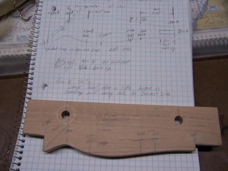 Here is the belly wgt location and the hook locations. You can get dim. from first post blueprint. Tail wgt is 5/16 dia by .600 long. I would drill the front belly hook hole for a large grommet as you will need a long swivel to reach the thru wire, thus it will be a bigger diam. swivel, as it is a pretty fat plug at that point. The original used screw eyes. Thru hole is drilled on center. I put a 1/4" c'bore on front angle to allow for a smoother nose grommet fit. I bandsaw angle and sand in the final dim. at 40 degree angle. This plug will swim pretty deep and with a very nice wiggle. It is a winner and I like this size better than the larger size but that is just my opinion.