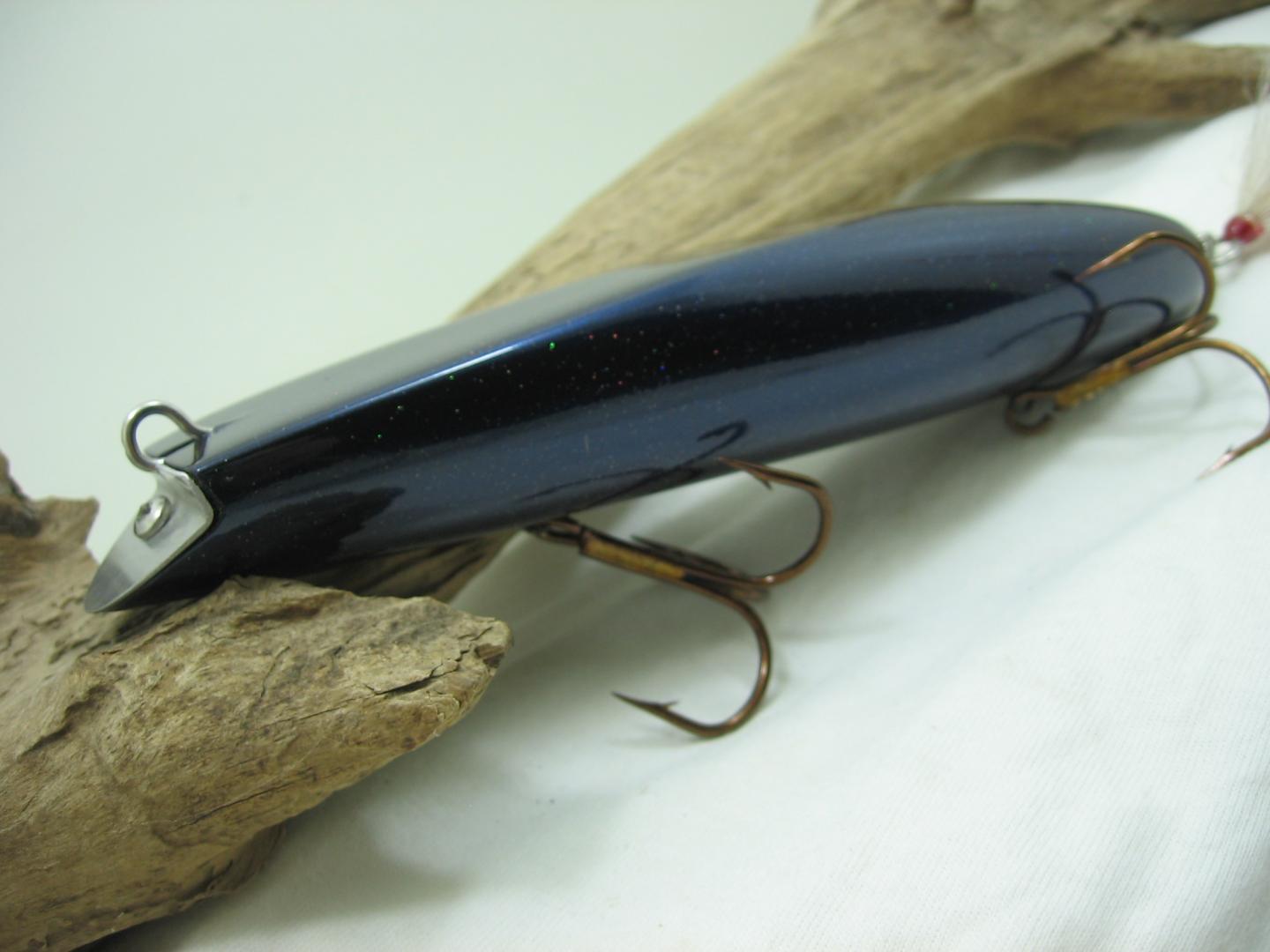 Here are a few new ones. The eels are Birch 8.5" long and weigh 2.25oz. I have them weighted to be a dive and rise jerk bait, Musky's do like a longer profile. The darter is a copy of a profile I did a couple years ago. It is maple 7.5" and 3oz. The paint is pretty slick, it's just black paint overcoated with Isis Blue Pearl and Rainbow metallic powders added to the clear. The last one was built to mimic those tiny fingerlings that like to hang out under any pier. It is basswood, throughwire, weighted, and comes in at just 1.5"