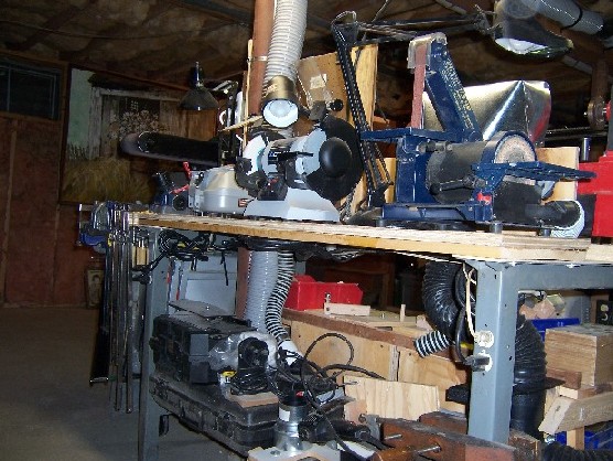 this si the sanding/grinding station, it hosts two belt/disc sanders, one 6"beltX 9" disc and one 1"beltX4" disc, one drill doctor, a variable speed grinder and a wet system for sharpening lathe tools, the table saw is stord under the end of the bench, 2" drops from the main dust collector go to the large sander and are controlled by a 2" ball valve