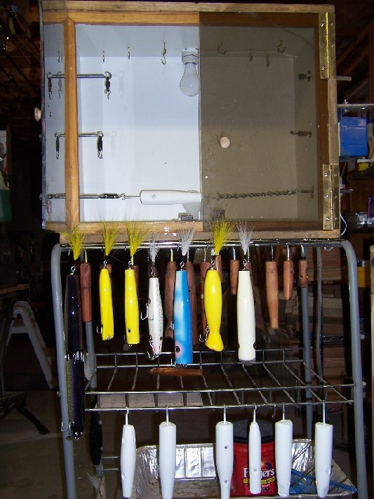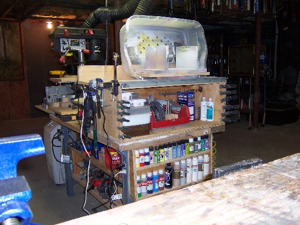 the spray booth is made from a pair of clear storage bins, the small one is a filter box, it contains fiberglass and charcoal media... keep in mind, because I use the air flow from my dust collector, only non flamable paints are sprayed into it... all other flamablees are sprayed outside...