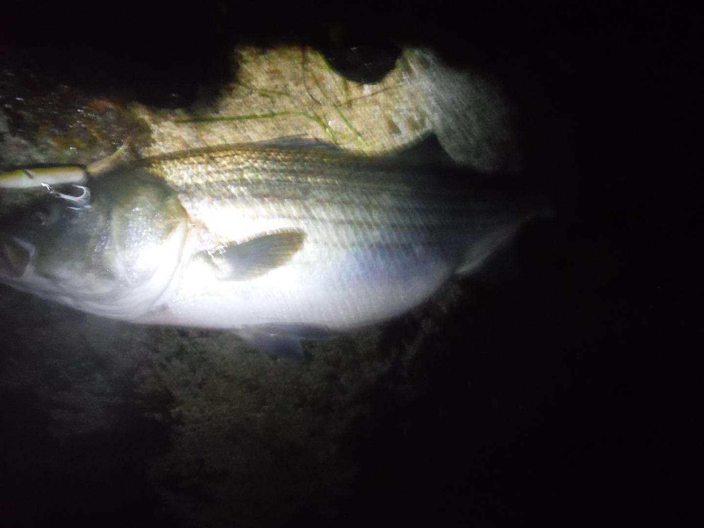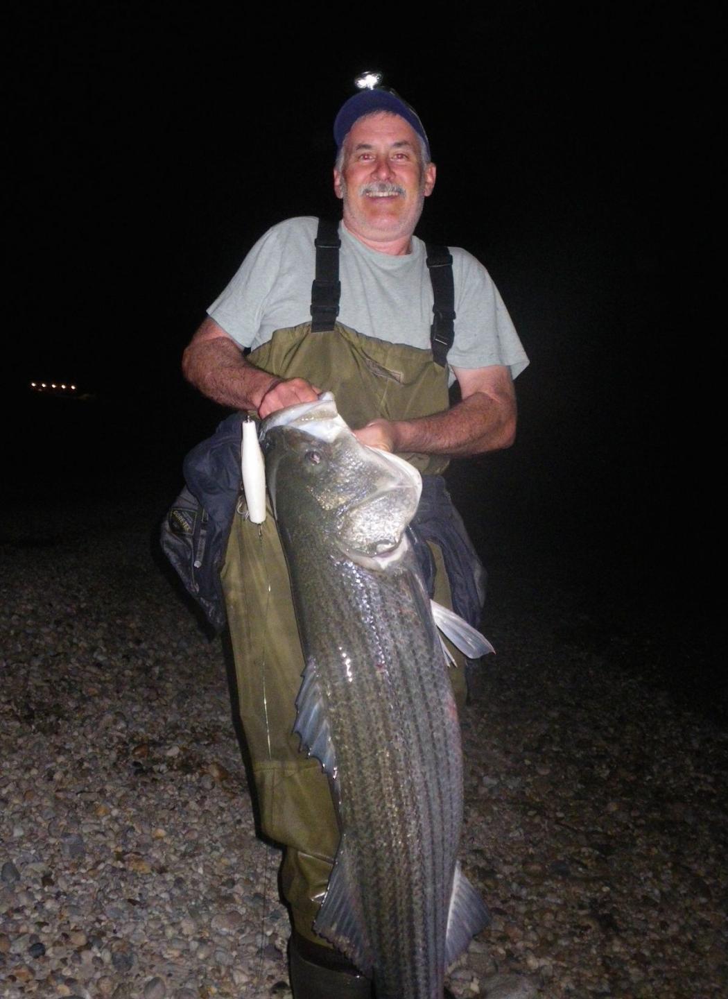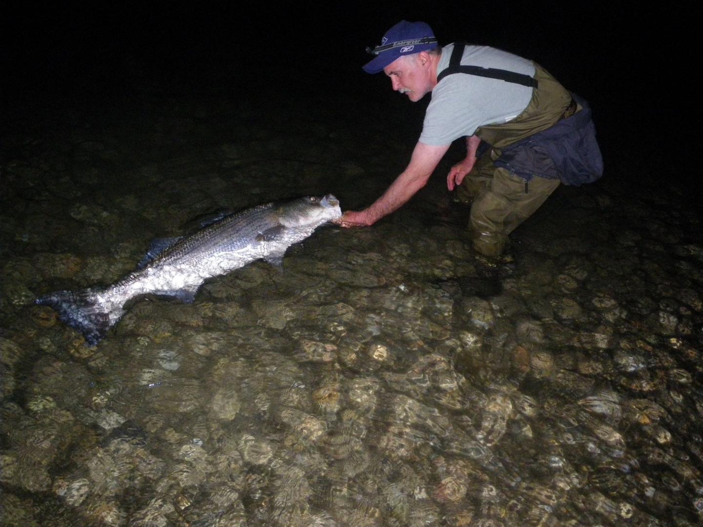 Couple nights later the first pic is a mid 30 lb fish caught on a really cool plug. It is an over a foot long needle made by a gentleman from Conn. that I got in a trade. Gigantic is the only way to explain it. Was really fun using that plug and the fact it floats allowed me to fish it real slow with a lot of pauses like few nights before. Fight was great but the fish put the siwash thru my finger landing it, lucky I crush the barbs. The next fish was the best of the few nights. I wandered away from the few guys I was fishing with that night and again the med white danny just twitched on the surface and reeled extremely slow was the ticket again. The fight was one of the best I have had in years with tons of drag being taken on several great runs but being only sand in front of me there was no anxiety of losing the fish on rocks or structure. Very enjoyable. All the above fish were revived and swam away. I do sell fish but it was quite rewarding letting these fish go.
