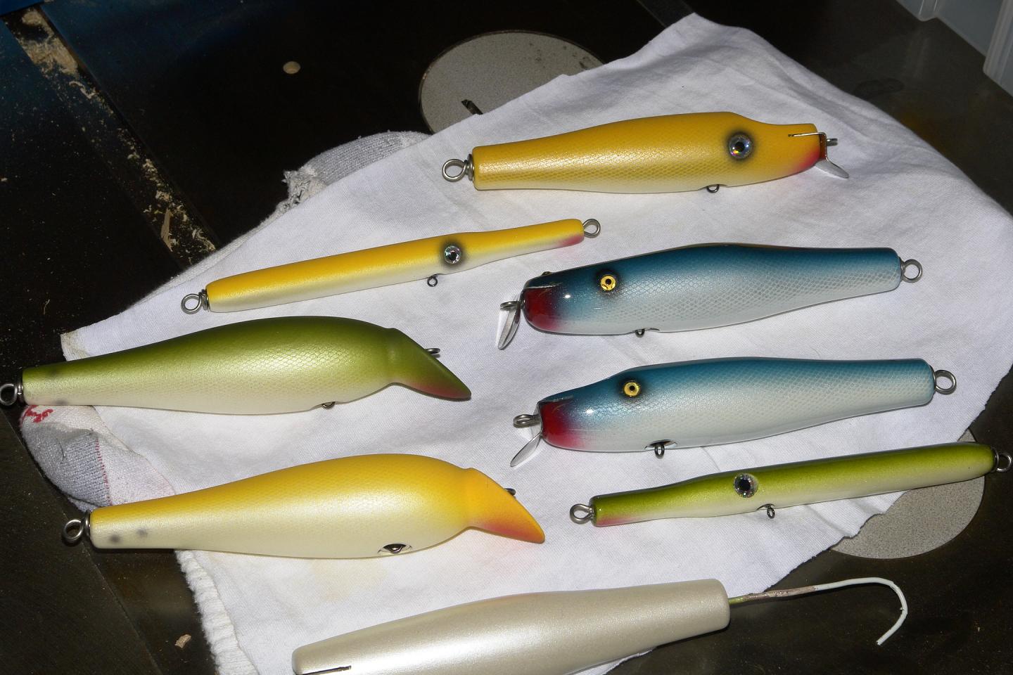 Heres where I stand . Birch, maple and a few AYC. I am really starting to enjoy making darters. Fast becoming my favorite plug to make. You have to be pretty precision on your fixtures and your machining and I luv that kind of stuff. I will say this though I have a lot to learn as far as getting them all to be good performers and lots to learn about fishing them but I always have George to bug as far as that goes.