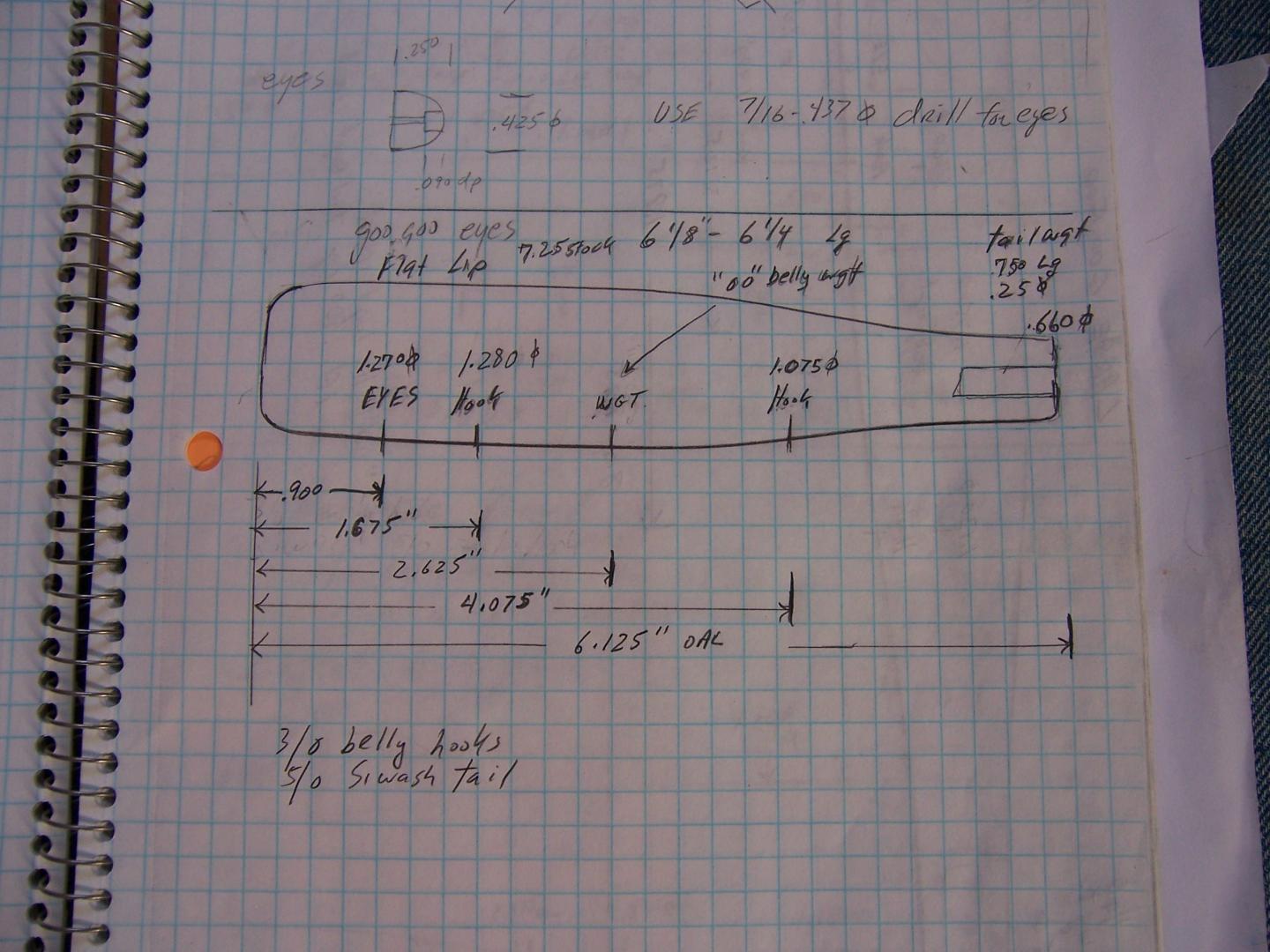 Here are the specs on the med. ones. In the pic you can see I used a flat lip on the med. ones compared to the traditional lip used. I had one with the flat lip so I made a few. It makes it more of a surface plug compared to the deeper diver the traditional lip gives it. I have seen the flat lip used on the large ones and med. plugs. You can use the traditional lip on the med. plug which is how most came. These are only 2 of the sizes I use there are a few more sizes but I would use these so that is all I made. You can also put eelskin grooves in them too.