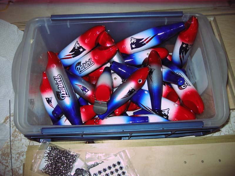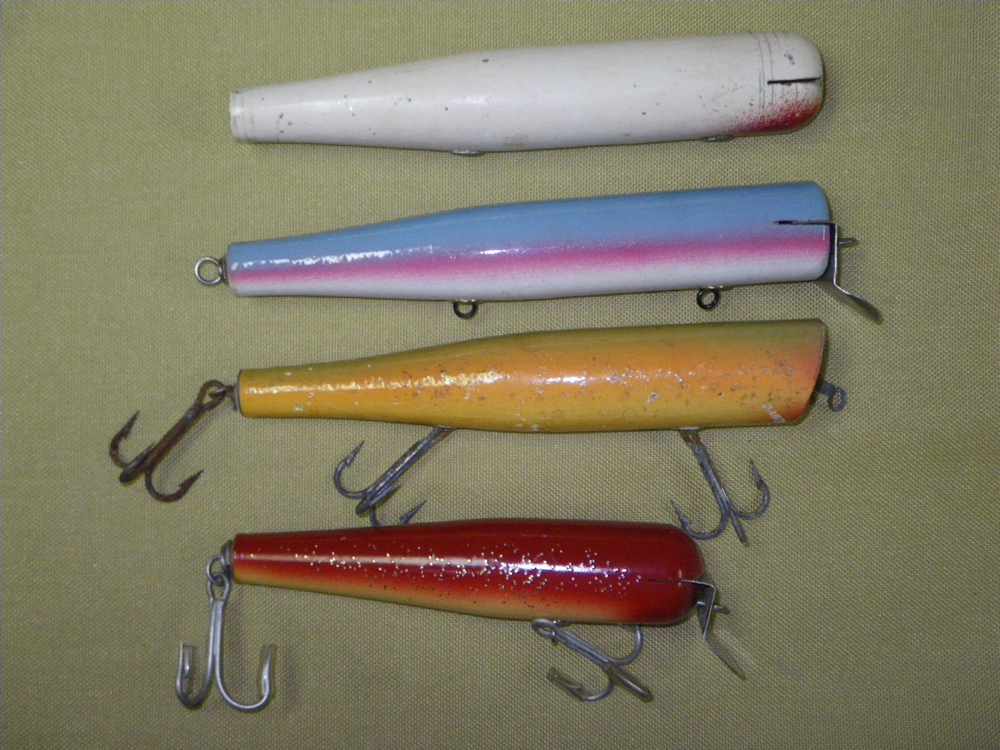 The med size is 6" long on the nose//1-5/16" dia.....the smallest is 5-1/8" long w/the dia. being 1-1/16 instead of the reg. 1-5/16" the others are...capt'n bill's // bob pond and woolner also made poppers from their swimmer bodies.As did alot of RI builders back in the day....one body..two plugs....I made one plug style I can get 3 different lures from...needle-swimmer an a spook....but it gets boring turning alot of the same at once.