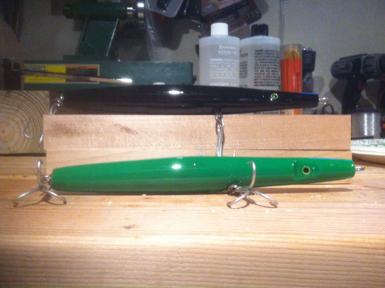 Finished turning and drilling my version of the wadd, 8.5" and 3-3.5oz, level sink, my best producing plug last season. Going to do "ribbed" versions too. Realized I didn't have enough weights to install and fill em all, so waiting on those.