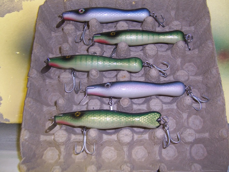 Next are some 6" 40 style swimmers, I tail weighted these and power them with a modified danny lip... I love the action ( so did the fish).. and they drill into the wind....I tried several different woods and weighting schemes and lips.. the above combo and WRC gave me the best action..