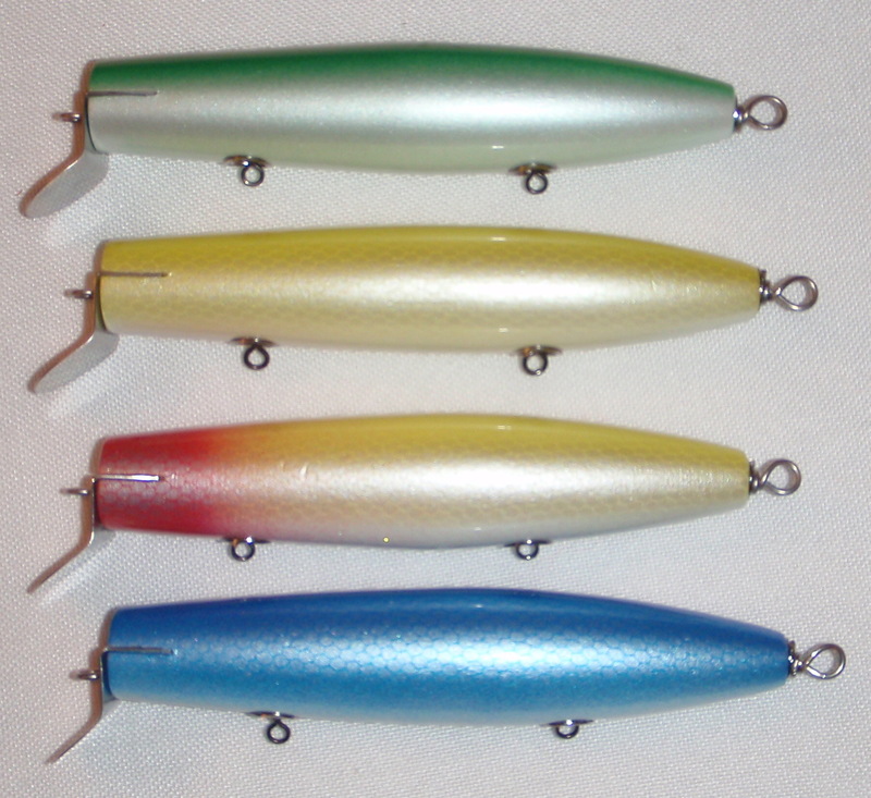 Just finished off a bunch of Musso Donnys. The first picture are Juniors- top is a maple 3oz, middle two are pines 2.5oz, and a surface swimmer 2.375oz. Second picture are Seniors, Top two are Pines 3.375oz and a surface swimmer 3.25oz. Finally, a family picture. All weights are rigged with 3 trebles. Some of the weights are a little off traditional Musso's so I'm curious to see how the perform.