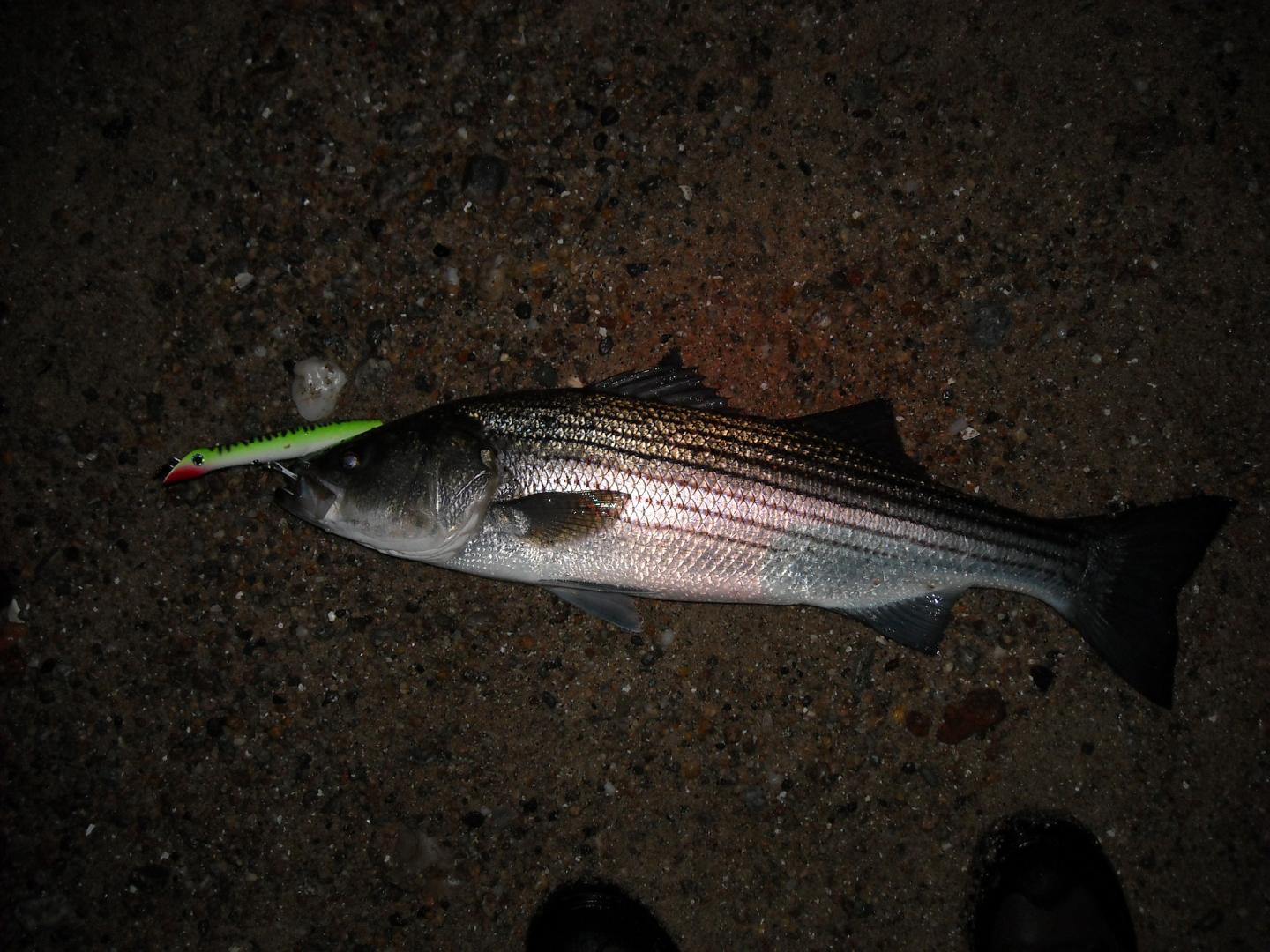 Here's a conrad fish, nothing special (maybe #15), but illustrative that you need to cover the water column top to bottom when you fish. Tough night, very calm and little sweep, nothing showing. Worked the jetty spot thoroughly with dannys (surface), darters (midwater) first without a touch. I was pretty sure it was empty, but felt compelled to try dredging the bottom. Drove a conrad down, worked along real slow, made about 10 cranks and pow. Telling that this fish must have watched the other plugs pass over it 30 times without interest, but when I put a conrad in front of its face...... bingo.