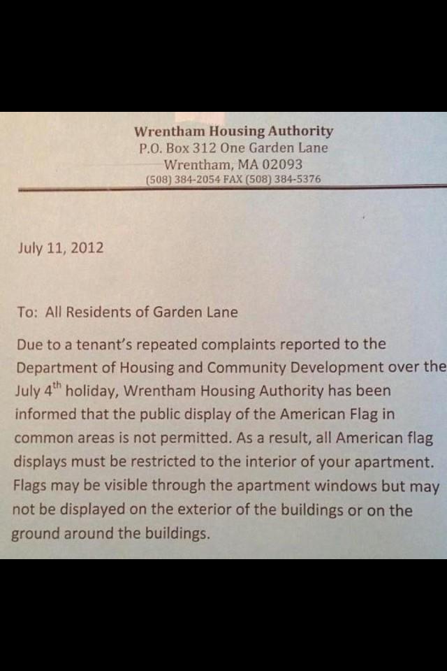 OK, looked it up - legit - then quickly overturned too: State reverses flag ban at Mass. housing complex - Boston.com