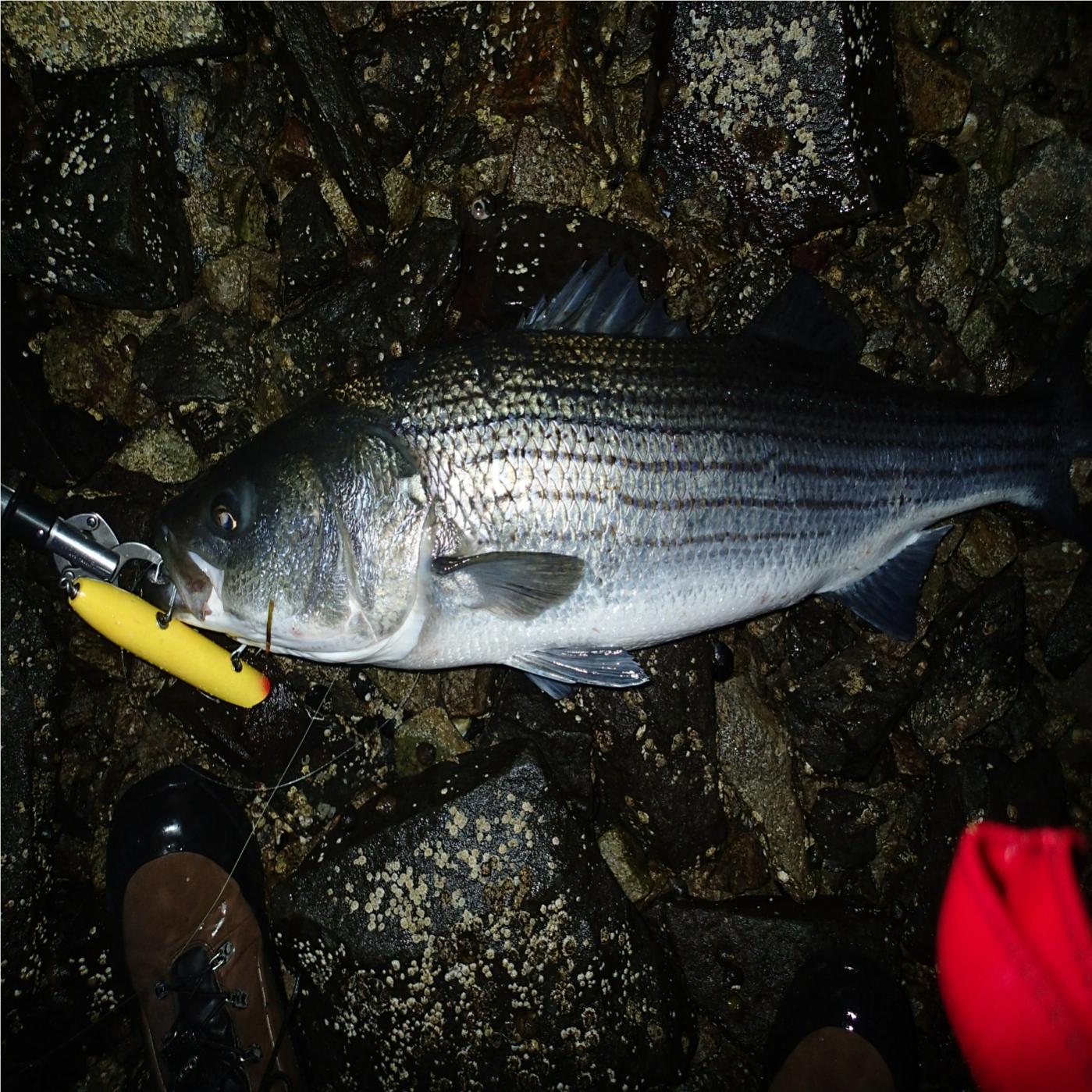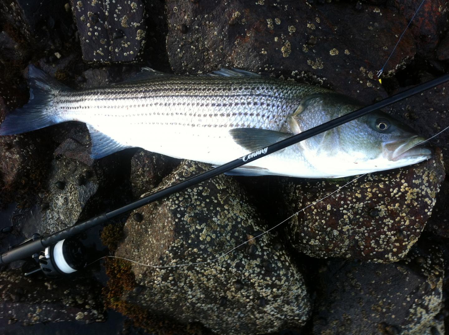 Got this low 20ish fish this morning on a 2.25oz skinny pencil in "great white" color scheme. Pic doesn't do the fish justice, but it went airborne several times during the shallow water battle and was a real pretty fish when it hit the rocks.
