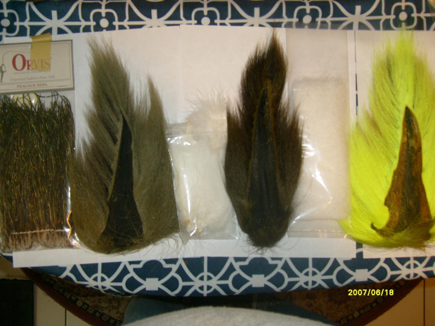 3 Bucktails. some cuttings out of each, package of peacock herl, package of white marabou, package of white flashabou $15.00 shipped