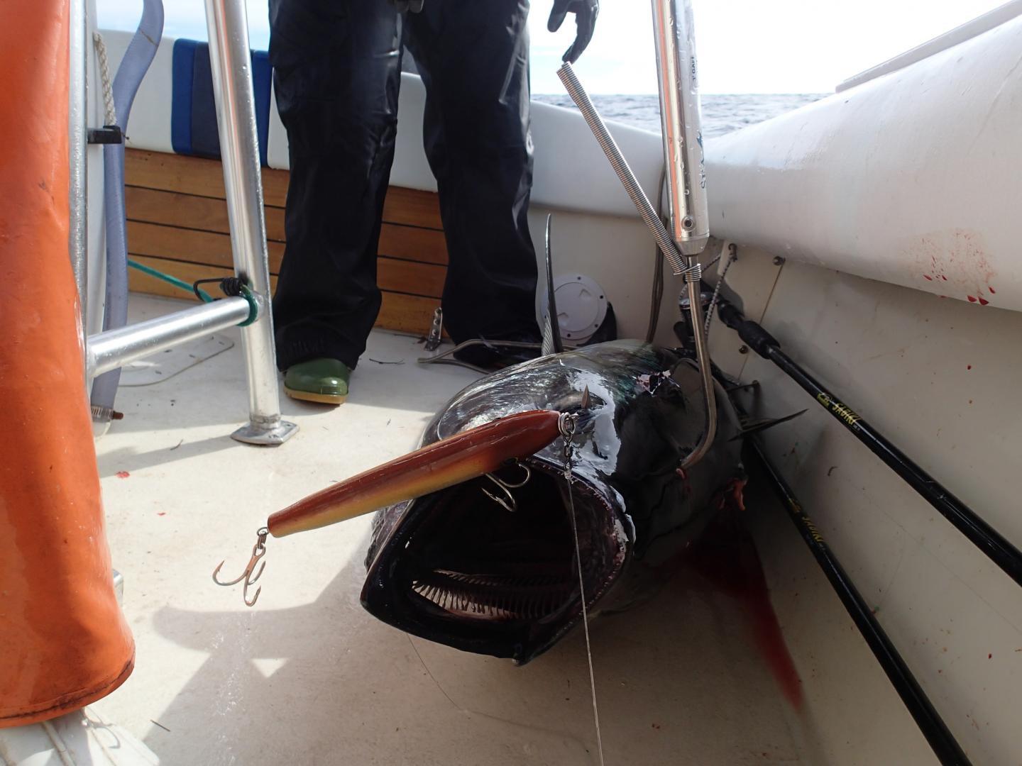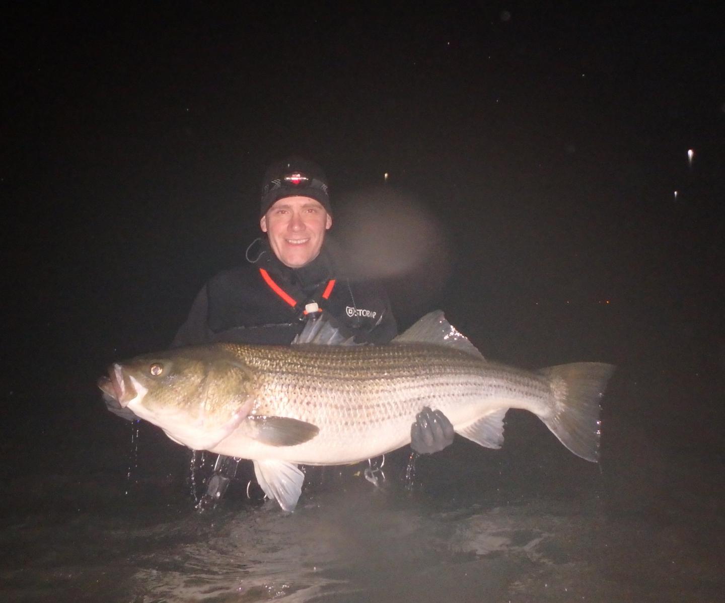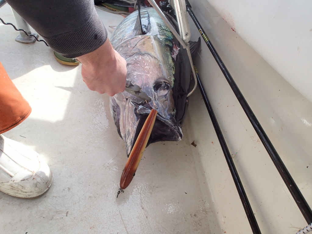 A hair less than half the weight of Jay's fish big one at just 25 pounds, but landed on the first cast ever with one of his maple Musso copies. That plug is now either blessed or jinxed.