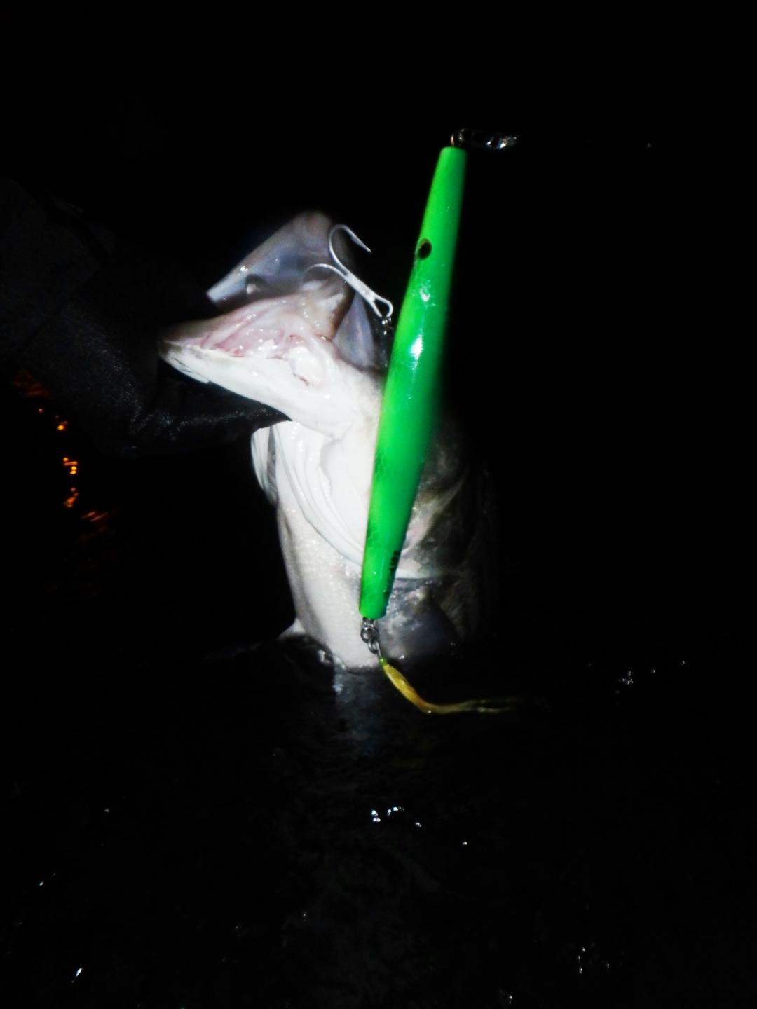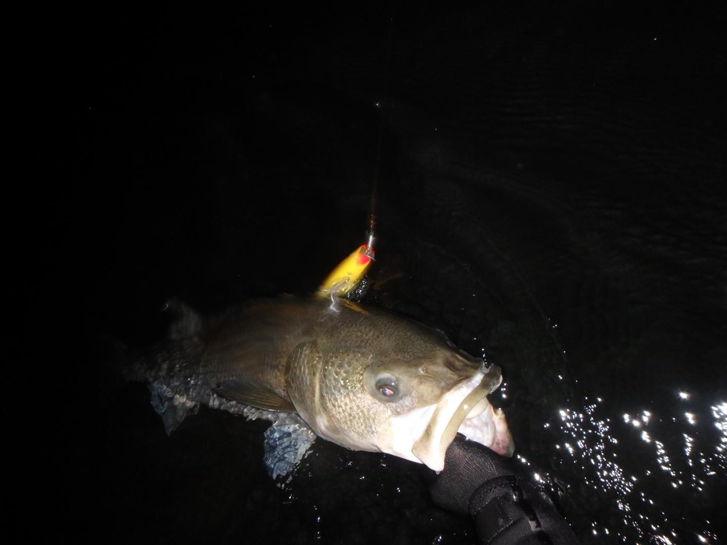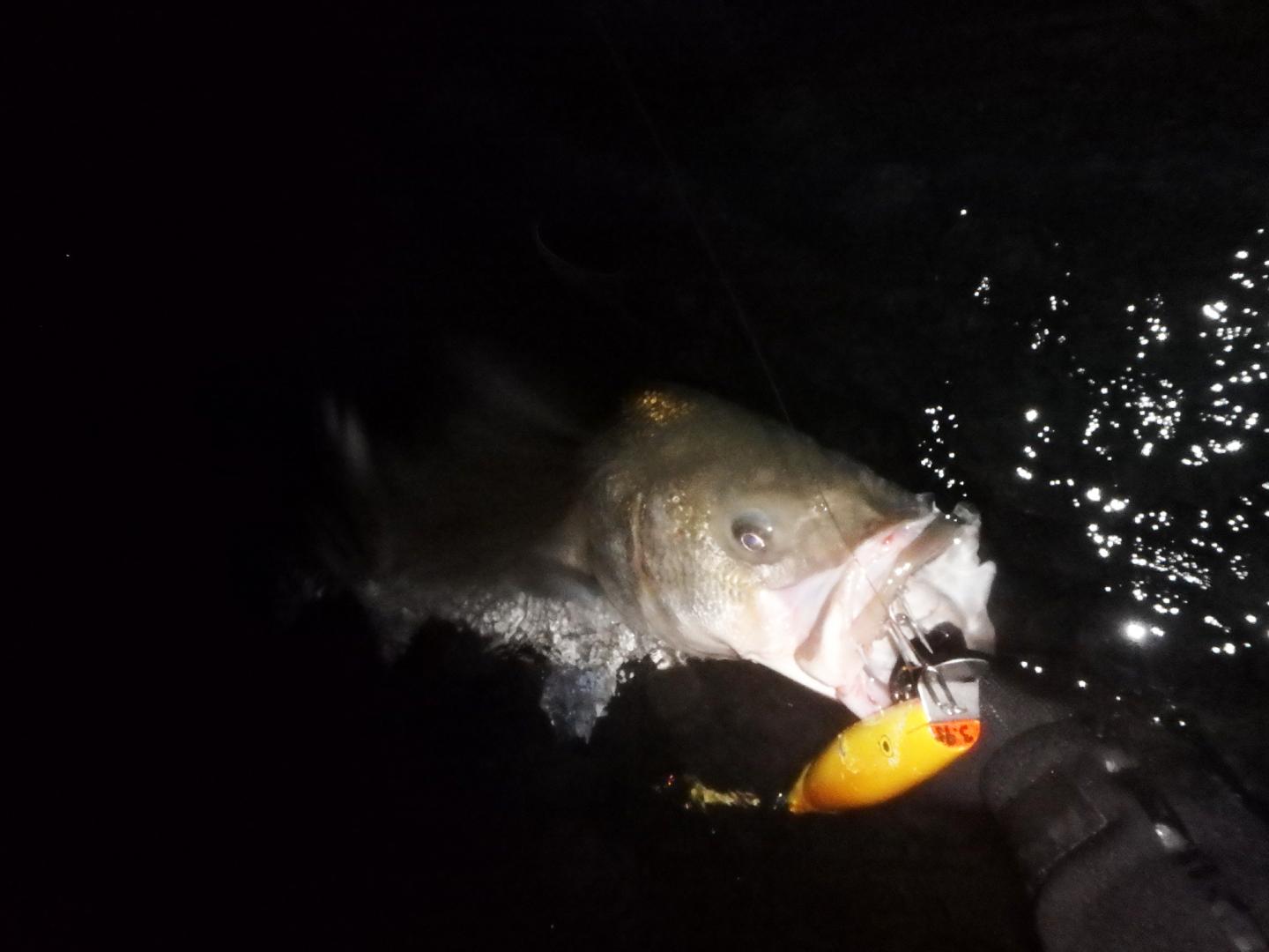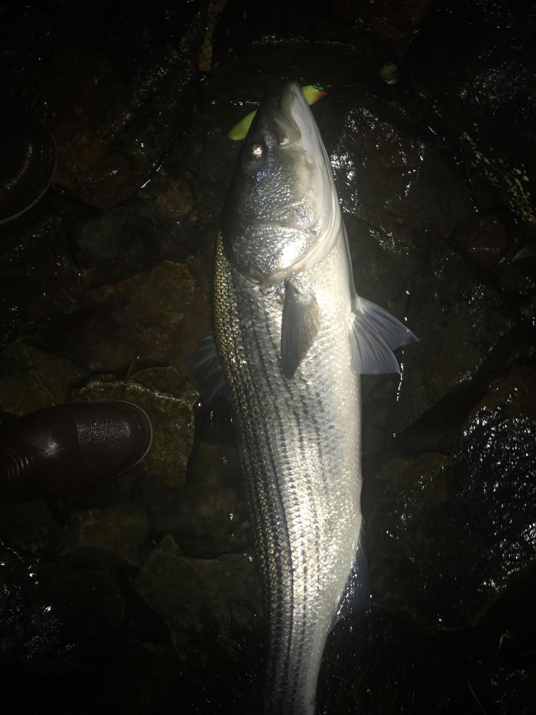 And here are a pair of fish landed on a JLH maple Donny that has ben very productive for me this year. The one with hook in the back of the fish's head was 33# but felt like a tank due to the hook placement. I was getting a bunch of weird hits and dropped fish before landing this one that night. The bass were either having a hard time zeroing in on the plug or they were just looking to kill it. The other one hooked properly in the mouth was mid-20s.